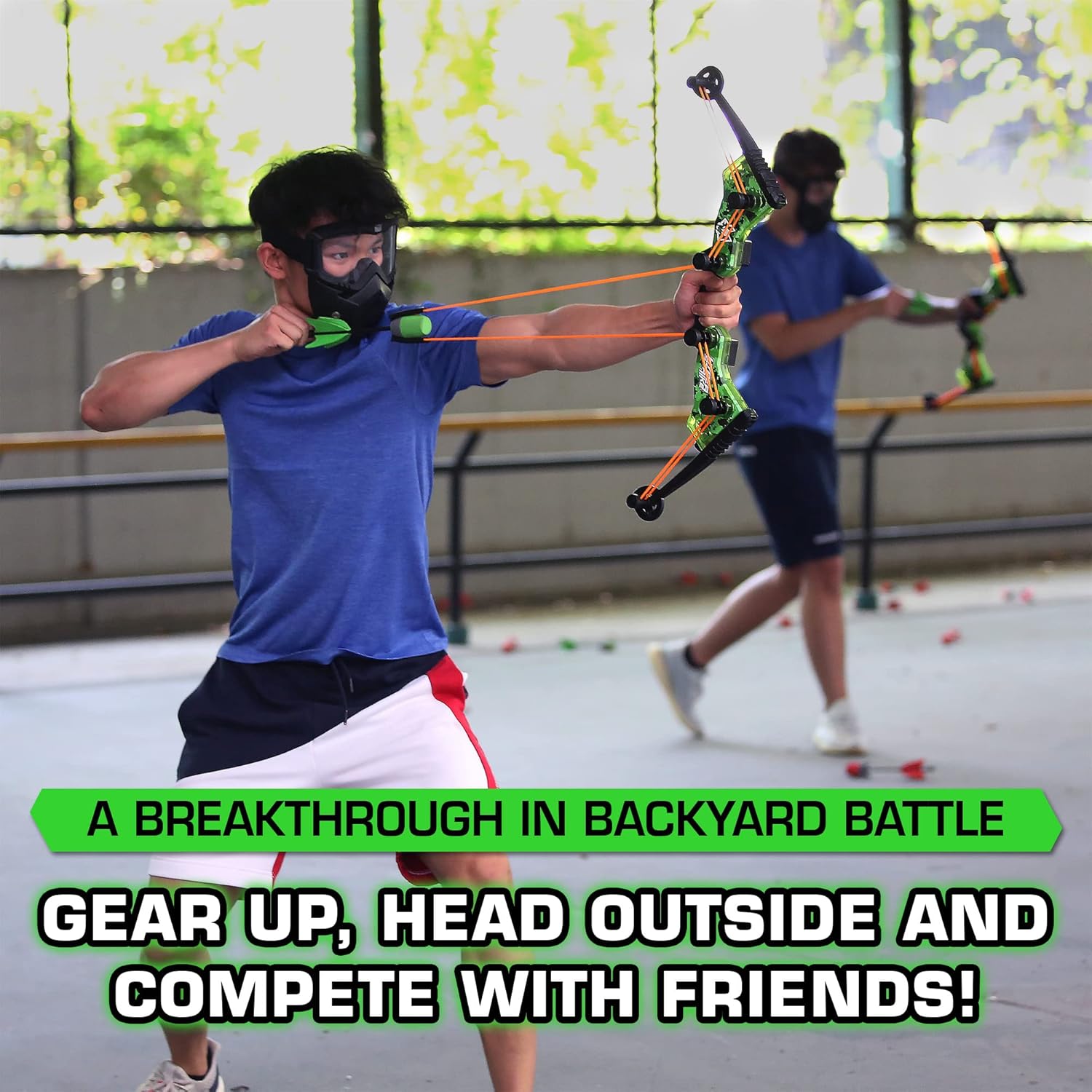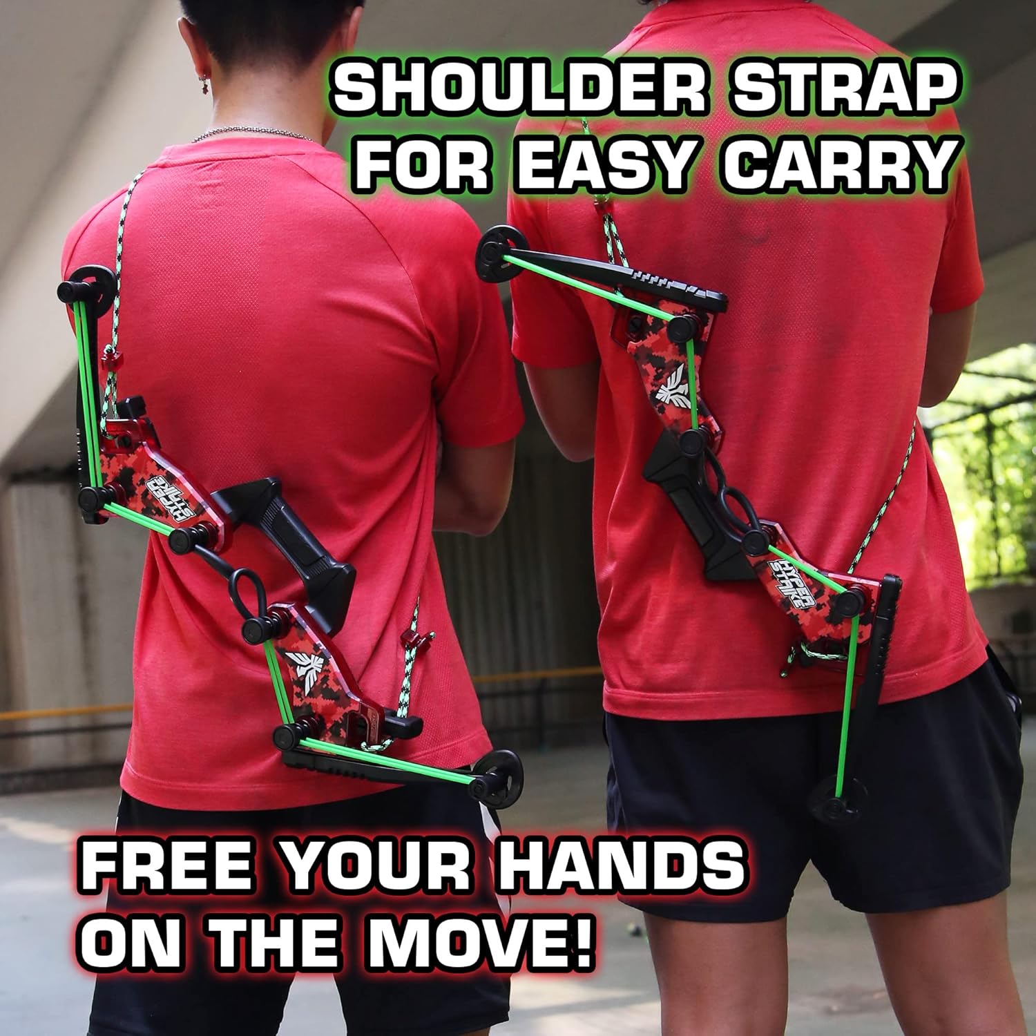 - BREAKTHROUGH IN BACKYARD BATTLE: Play as Team Red or Team Green. Gear up, head outside, and compete with friends using the best performing toy bows on the market. With the detachable, adjustable shoulder strap equipped, you can easily move and carry it on the battlefield; Your hands are free to help you move through the terrain!